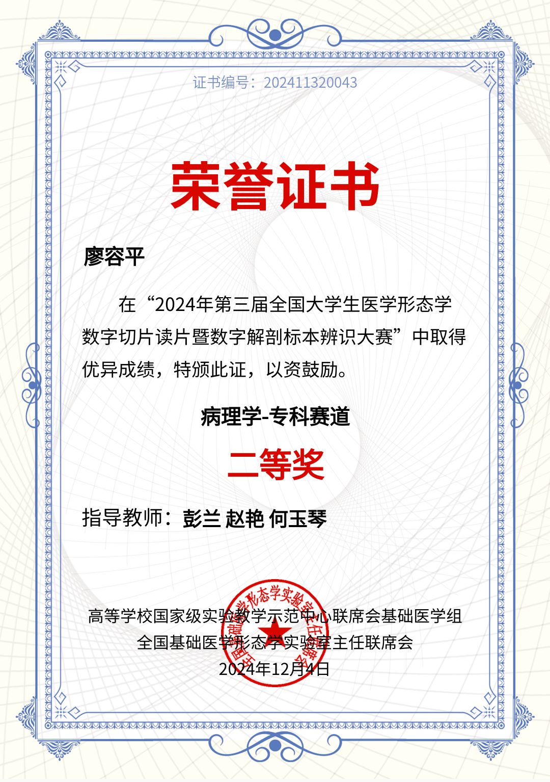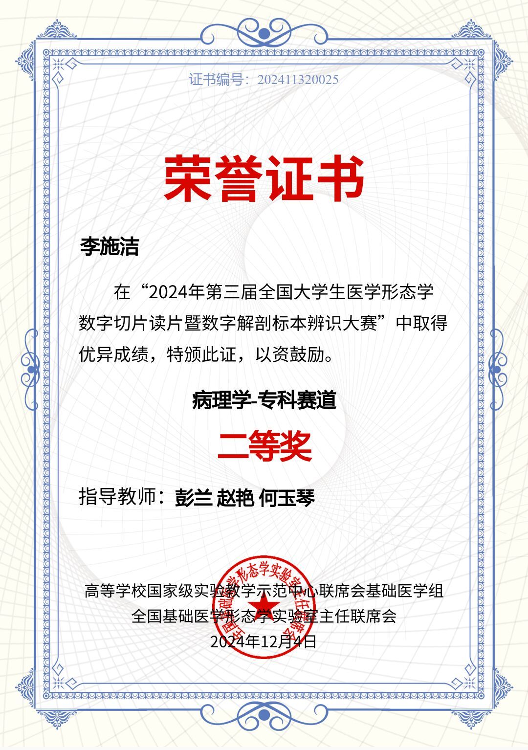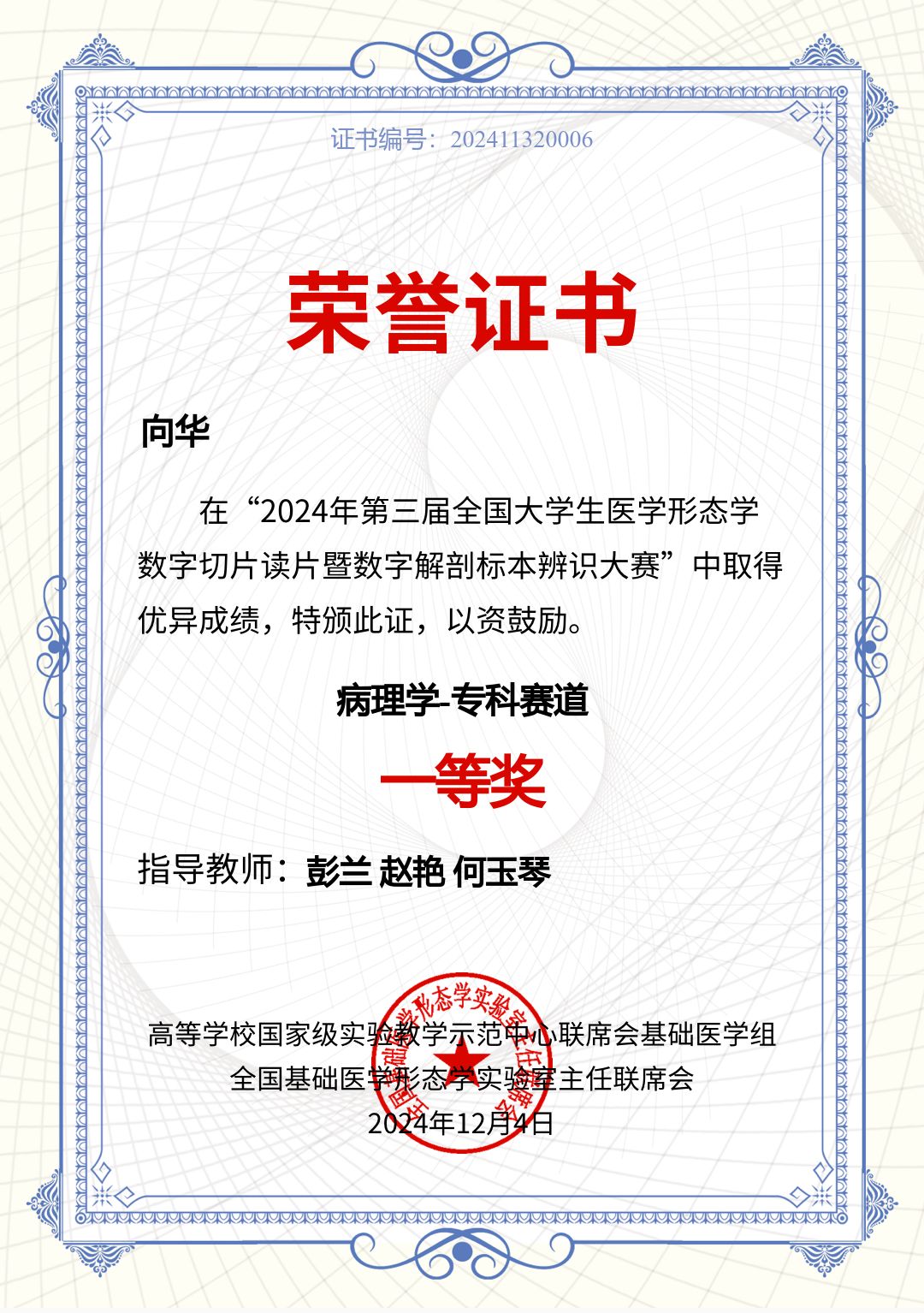 此次大赛备受瞩目,吸引了全国230余所高等医学院校积极参与,共有14000余名医学生同台竞技。临床医学院参赛选手在彭兰、赵艳、何玉琴三位老师指导下,在病理学-专科赛道表现卓越,脱颖而出。其中,23级临床医学7班向华荣获一等奖,23级临床医学6班廖容平、23级临床医学(医美辅修)1班李施洁同获二等奖。