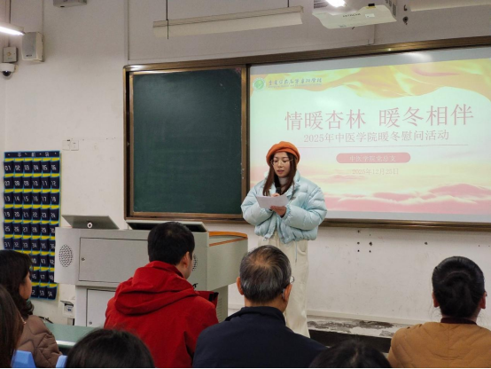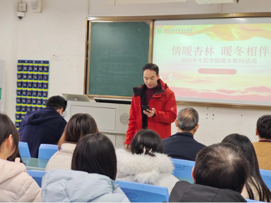 中医学院党总支书记张毅书记发表暖心致辞。张书记首先表达了学院对同学们深切的关心与挂念,肯定了大家在逆境中勤奋求学、刻苦钻研的精神。书记强调,中医药学是中华文明的瑰宝,同学们肩负着传承与创新的重任,是中医未来的传承者,也是时代健康的守护人,学院永远是同学们最坚实的后盾,愿这份温暖能陪伴大家跨越寒冬,在岐黄之路上坚定前行。