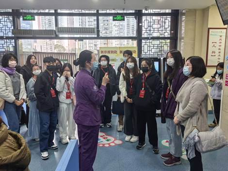 结合中国最新康养模式,护理学院接待来访团队参观了我校老年康复护理实训室,并结合实训室文化墙向其介绍了我国常见养老模式及社区延续护理模式。团队深入沙坪坝区天星桥街道社区文化服务中心,进一步了解中国“医养结合”养老服务体系,包括分级护理制度、智能健康监测设备及人文关怀实践。