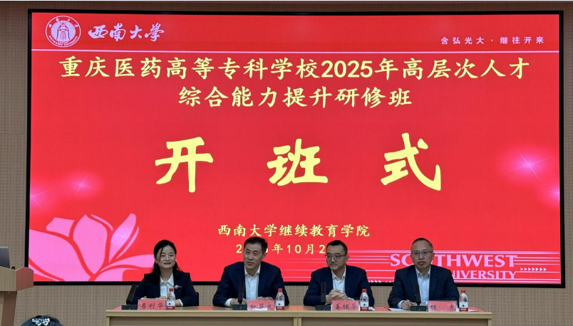 10月22日-24日,学校在西南大学举办2025年高层次人才综合能力提升研修班。重庆医药高等专科学校党委委员、副校长姜理华,人事处处长易利华;西南大学党委常委、副校长白显良、继续教育学院院长程龙出席开班式。重庆医药高等专科学校、学校附属第一医院以及附属陈家桥医院共60位博士等高层次人才参加此次培训。