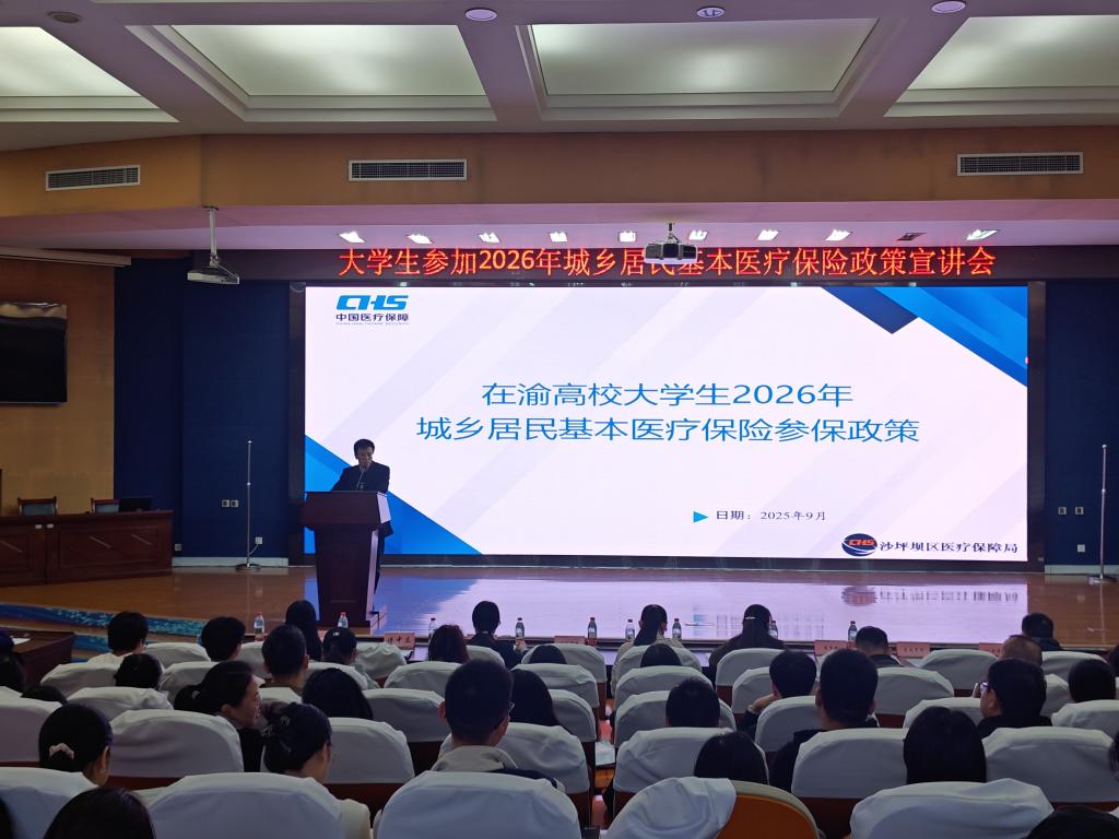 为贯彻落实《国务院办公厅关于健全基本医疗保险参保长效机制的指导意见》(国办发〔2024〕38号)和《国务院办公厅关于印发“十四五”全民医疗保障规划的通知》(国办发〔2021〕36号)有关要求,进一步保障大学生基本医疗需求,提高大学生健康水平,为建设健康校园做好有力保障,临床医学院于2025年11月12日下午,在学校图书馆六楼学术报告厅组织各学院相关领导和全校辅导员召开“2026年大学生参加城乡居民基本医疗保险政策宣讲会”。本次宣讲会特别邀请了沙坪坝区医保局、税务局相关负责人。