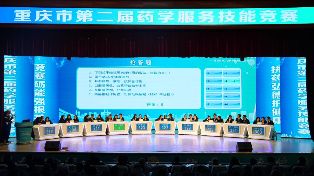 重庆市39个区县派出了基层医疗卫生机构代表队共计117名参赛选手参与了本次赛事。本次大赛分为药学门诊药师、处方审核药师、驻科临床药师等3个岗位,重点考核抗感染、呼吸内科、消化内科、心血管内科等专业方向的知识和技能。通过第一阶段的综合笔试和技能操作,大赛产生了10支优秀队伍挺进决赛。最终通过12月5日的案例展示和紧张的知识竞答环节,决出了团体及个人一、二、三等奖,案例展示一、二、三等奖等奖项。药学院(中药学院)300名学生到现场观摩了决赛。