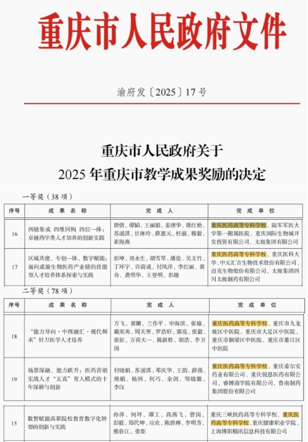 近日,重庆市人民政府正式印发《关于2025年重庆市教学成果奖励的决定》(渝府发〔2025〕17号),全市职业教育领域共评选出教学成果奖140项,涵盖人才培养、产教融合、教学改革等多个核心领域。学校凭借深厚的教学改革积淀与创新实践,斩获多项殊荣:以第一完成单位荣获一等奖2项、二等奖2项,以参与单位再获一等奖1项,充分体现了学校的综合实力与育人成效。