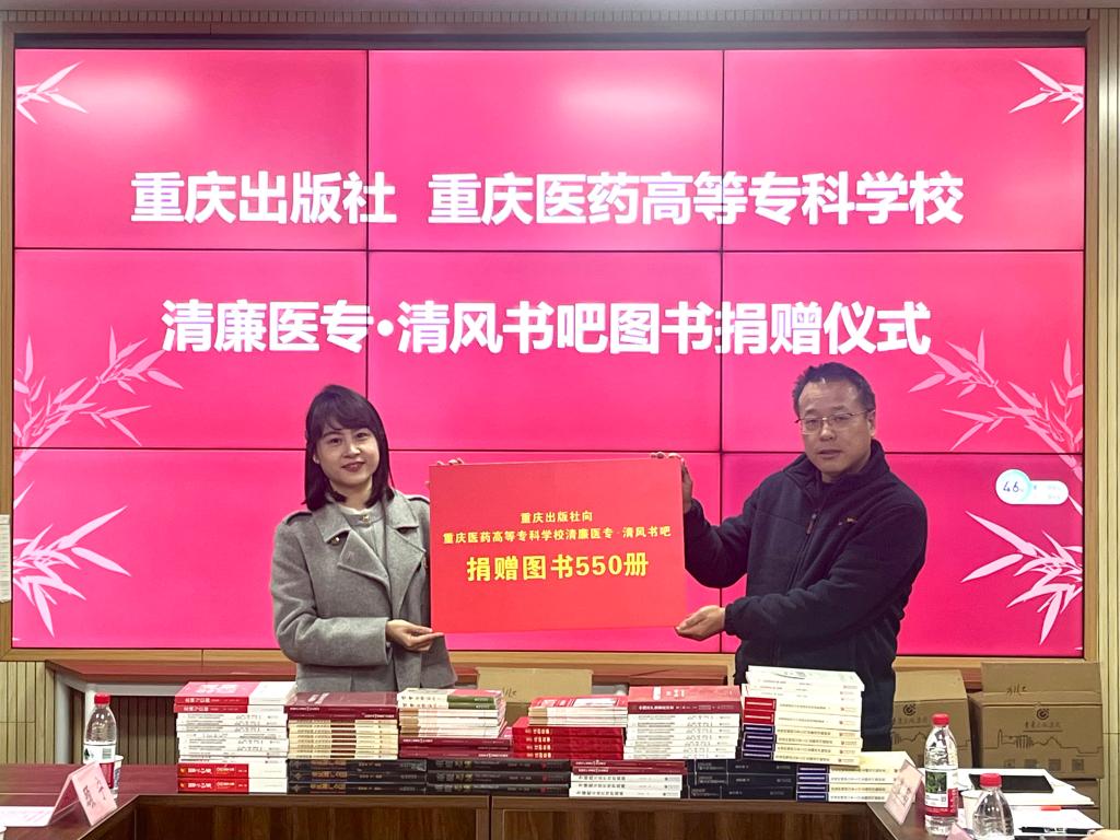 1月6日下午,重庆医药高等专科学校“清廉医专·清风书吧”图书捐赠仪式在学校3号实训楼3210举行。重庆出版社党群人力资源一部副部长黄乐一行5人,学校党委委员、纪委书记周刘丽,纪委副书记王阗春,以及药学院(中药学院)党政领导、教师代表参加活动。活动由唐倩主持。