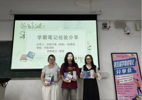 分享现场,获奖学子依次登台,化身榜样引路人,倾授学习心得。医学技术学院蒋欣悦同学以“习惯筑基”为核心,阐述日常笔记积累与知识体系搭建之法,务实笃行;药学院罗若溢同学立足“思维进阶”,拆解图表梳理、关键词提炼等高效学习技巧,逻辑清晰;中医学院蔡瑶同学“融思践悟”,将笔记沉淀与专业深耕、临床实践深度结合,尽显笃学思辨之风。