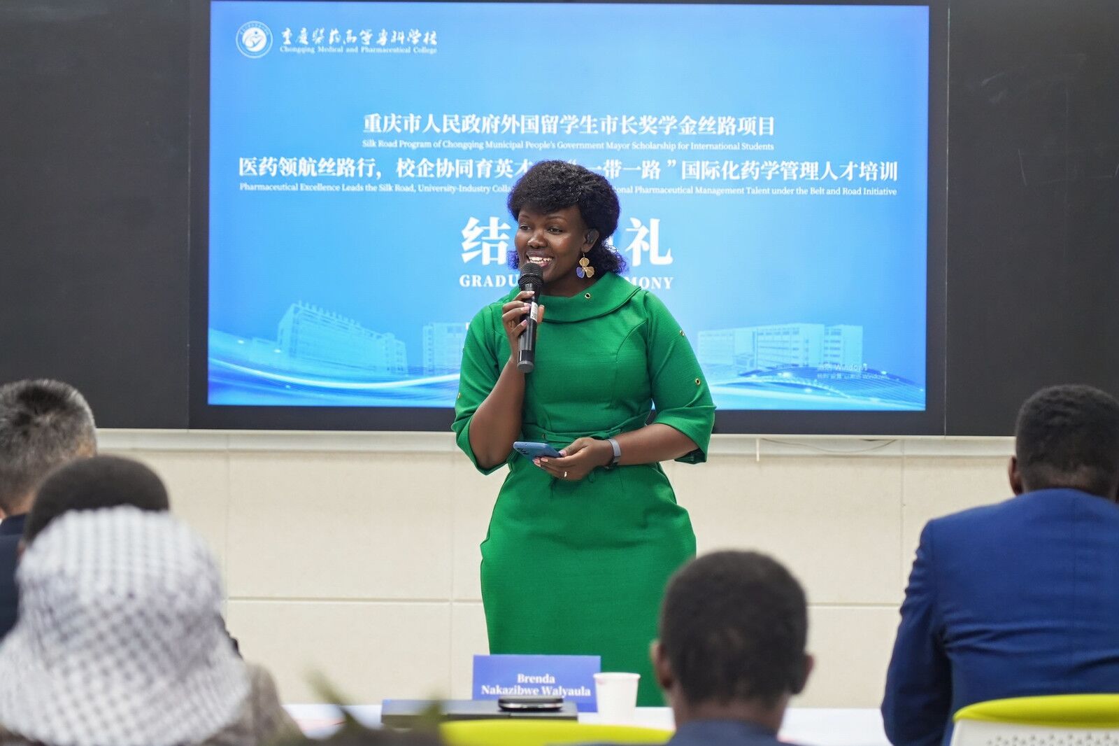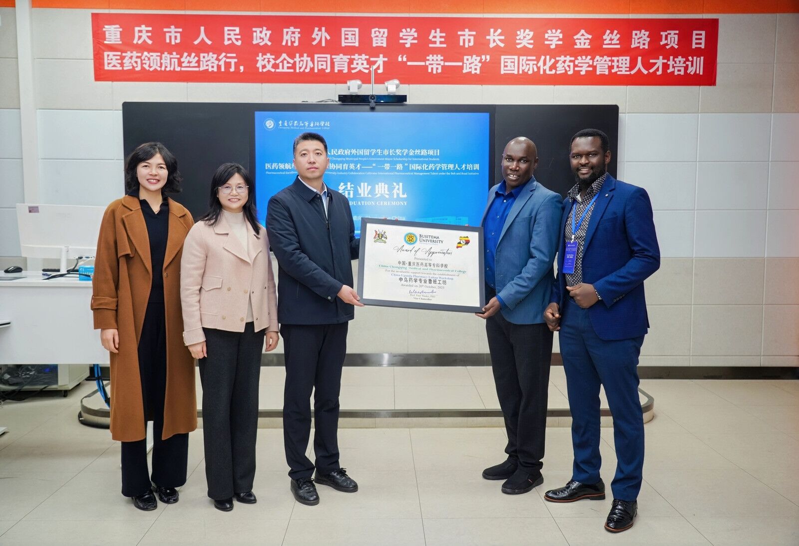 2025年11月21日,重庆市人民政府外国留学生市长奖学金丝路项目——“医药领航丝路行,校企协同育英才:‘一带一路’国际化药学管理人才培训”结业典礼在重庆医药高等专科学校隆重举行。学校党委委员、副校长彭坤,学校教务处处长王丽、药学院(中药学院)副院长苏湲淇、学校授课教师代表以及乌干达代表团全体学员共同出席典礼。